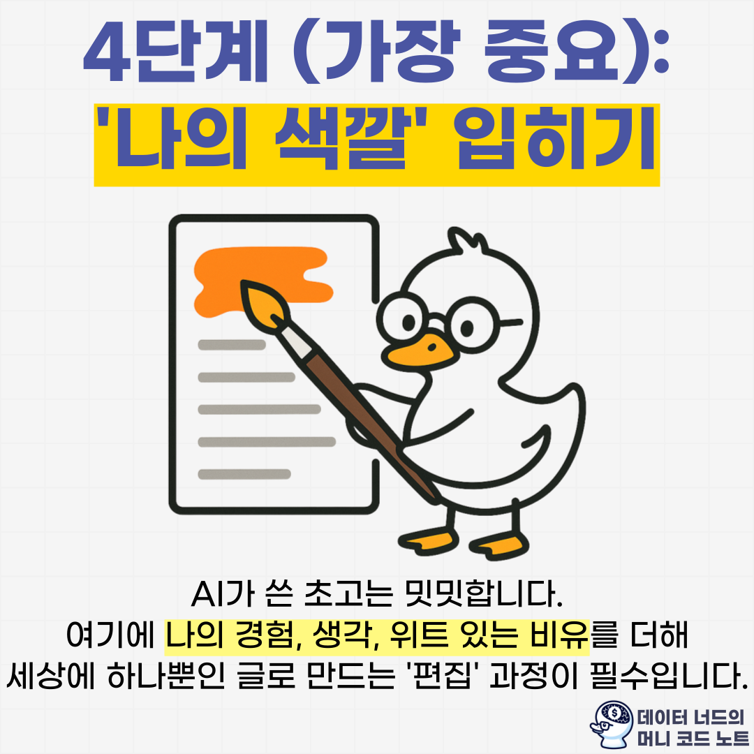 AI가 만든 초고는 뼈대일 뿐, 영혼이 없습니다. 이 단계에서 저는 AI가 쓴 문장을 저만의 문체와 비유로 바꾸고, 제 실제 경험담을 녹여내며, '너드 오리'와의 대화를 추가하여 글에 '생명력'을 불어넣습니다. 이 과정에서 부정확한 정보는 없는지 사실 확인(Fact Check)을 하는 것도 필수입니다. 이 4단계가 바로 '너드 K' 콘텐츠의 핵심입니다.