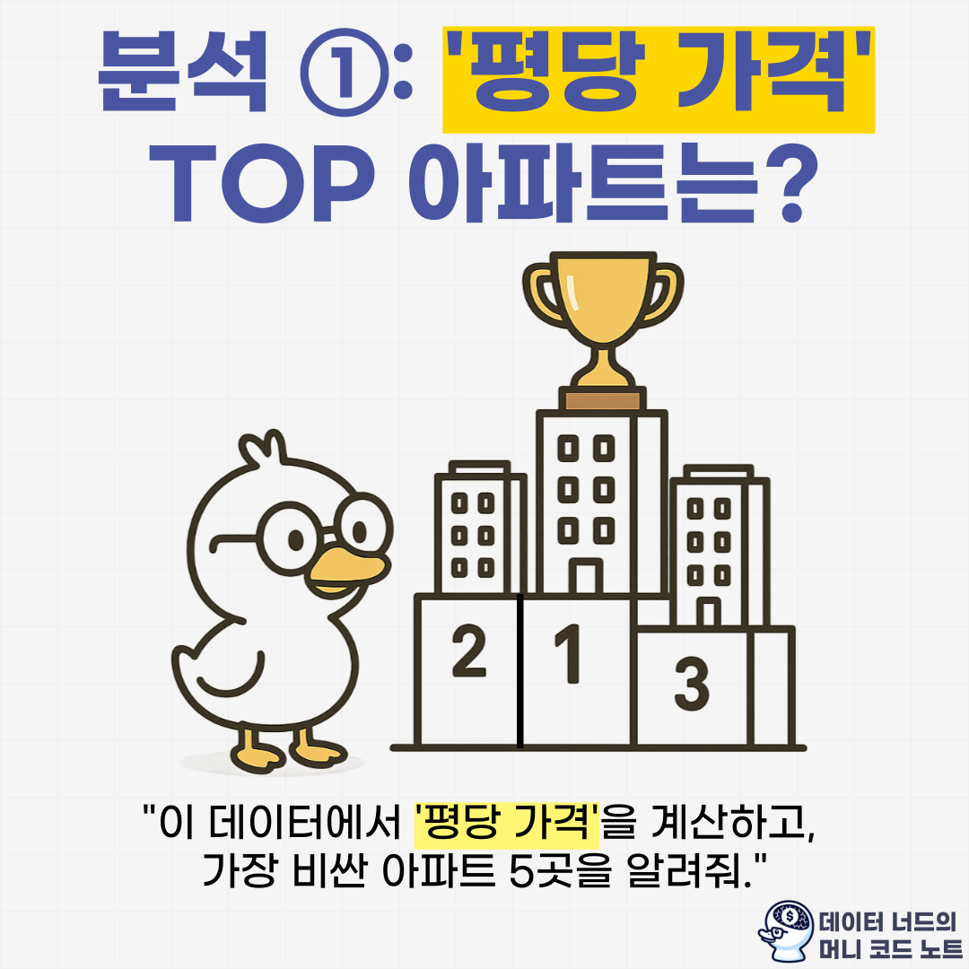 1. 특정 지역 '대장 아파트' 찾기 (평당 가격 분석)